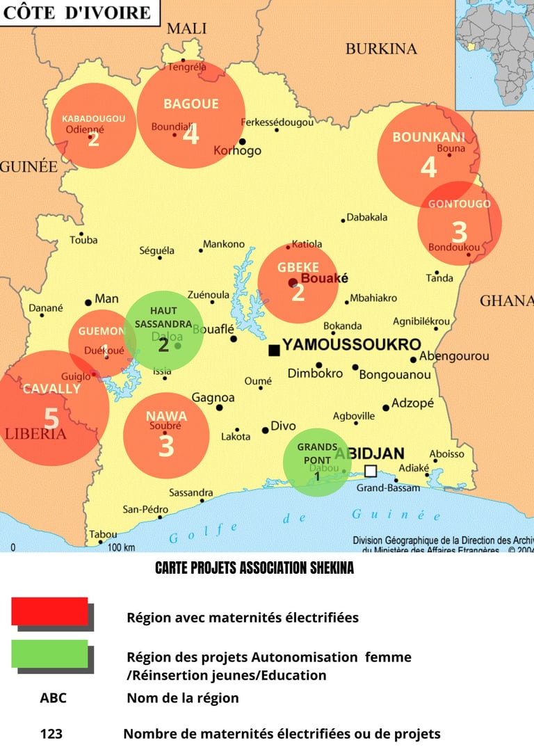 In its nine years of existence, the Shekina Association has successfully carried out several projects in ten regions of Côte d'Ivoire: Kabadougou, Boukani, Haut-Sassandra, Cavally, the Lagunes Region, Gbêkê, Guémon, Bagoué, Nawa, and Gontougo, with the support of its partners and donors.